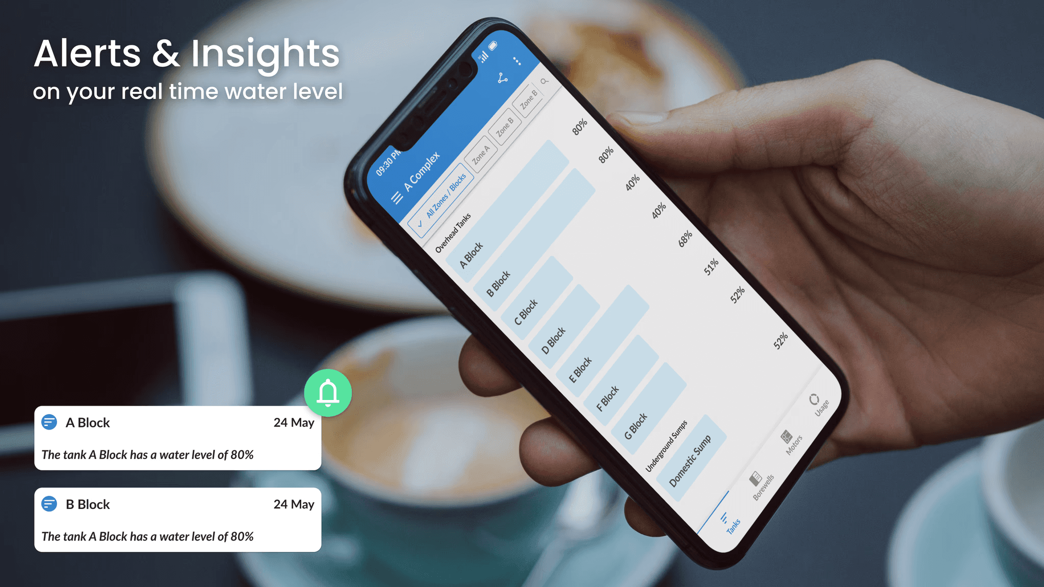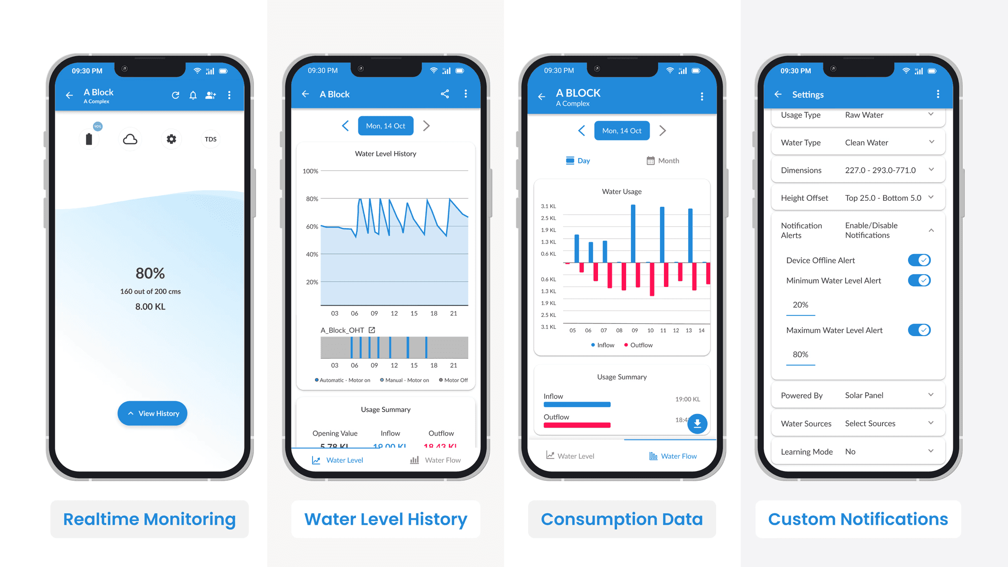 Provides real-time water-level data, usage insights, custom alerts, and maintenance reminders. The user-friendly app enables easy remote monitoring and detailed data analysis.