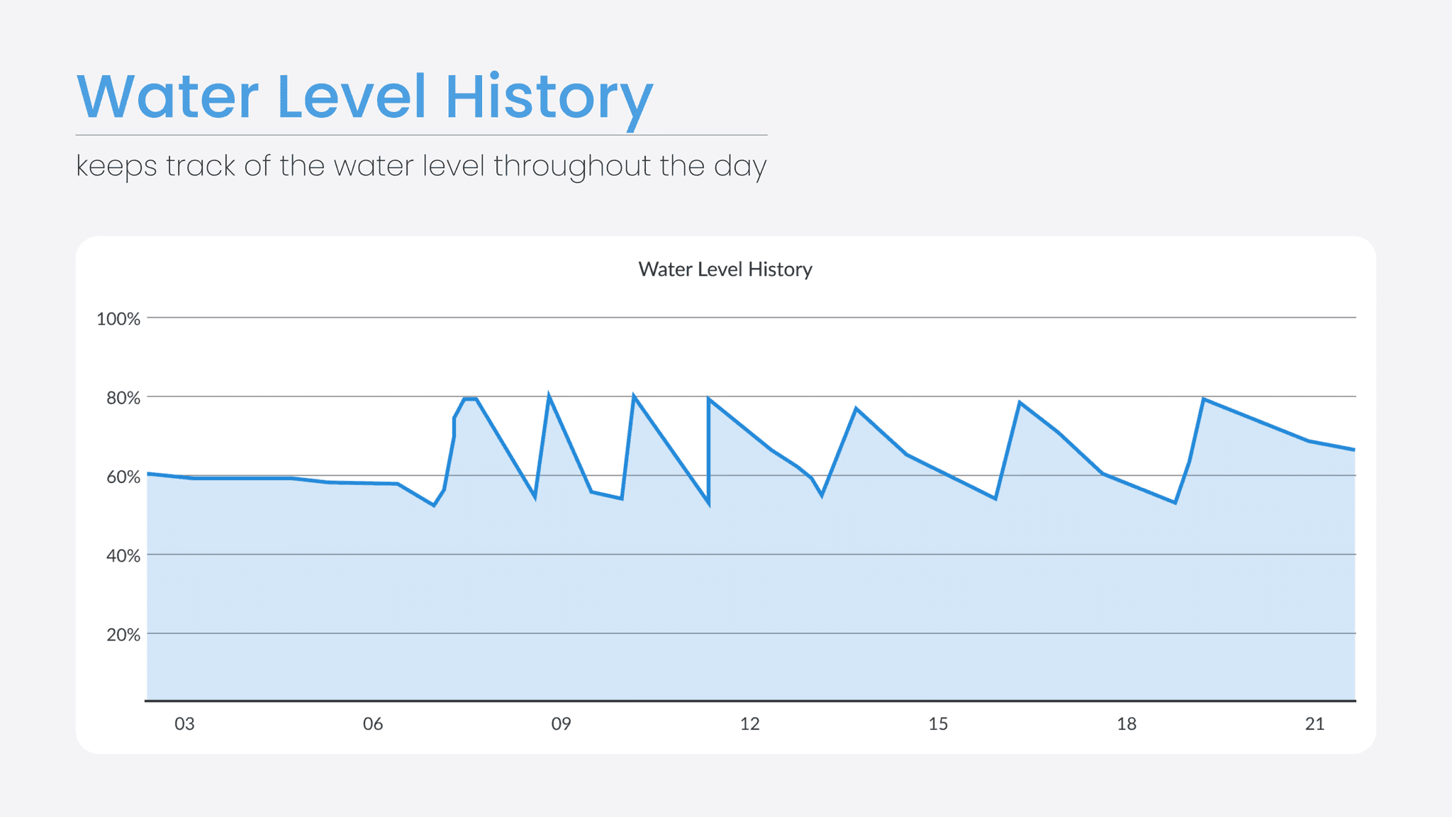 The water level history chart records the tank’s water levels throughout the day. It helps users identify peak usage times, possible leakages, refill speed, pump performance, and other important patterns that support better water management.