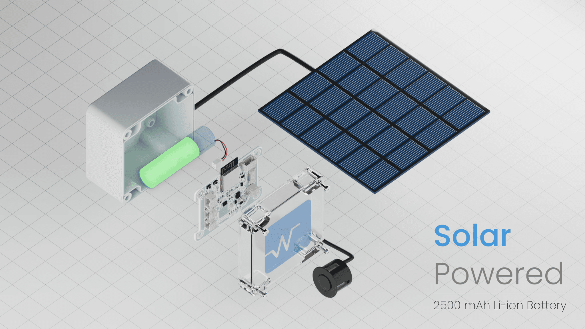 Powered by a 2500mAh rechargeable lithium-ion battery supported by a solar panel, allowing long-term, maintenance-free operation.